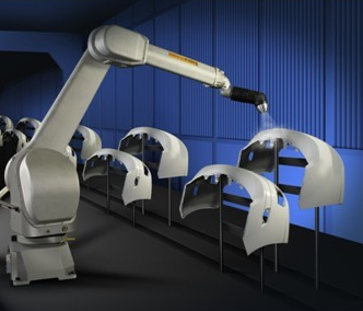 噴涂機器人又叫噴漆機器人(spray painting robot), 是可進行自動噴漆或噴涂其他涂料的工業(yè)機器人,1969年由挪威Trallfa公司(后并入ABB集團)發(fā)明。噴漆機器人主要由機器人本體、計算機和相應的控制系統(tǒng)組成,液壓驅動的噴漆機器人還包括液壓油源,如油泵、油箱和電機等。多采用5或6自由度關節(jié)式結構,手臂有較大的運動空間,并可做復雜的軌跡運動,其腕部一般有2~3個自由度,可靈活運動。較先進的噴漆機器人腕部采用柔性手腕,既可向各個方向彎曲,又可轉動,其動作類似人的手腕,能方便地通過較小的孔伸入工件內部,噴涂其內表面。噴漆機器人一般采用液壓驅動,具有動作速度快、防爆性能好等特點,可通過手把手示教或點位示數(shù)來實現(xiàn)示教。噴漆機器人廣泛用于汽車、儀表、電器、搪瓷等工藝生產(chǎn)部門。