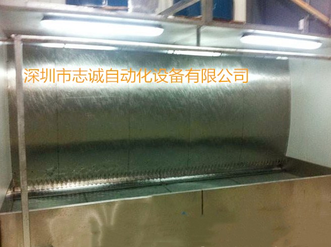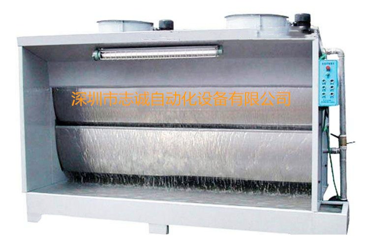 環(huán)保型水簾柜(噴漆臺)主要是由自吸水泵循環(huán)抽水往水簾板上均勻的流下來,噴槍噴出來的廢氣(漆霧)被水簾板上的水打到下面水池里。再有少部分的廢氣(漆霧)被上面的風(fēng)機(jī)通過排風(fēng)管道排出車間外面。使車間內(nèi)沒什么廢氣(漆霧)給大家一個好的工作環(huán)境。